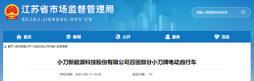 家電消費網9月12日訊     昨天,小刀新能源科技股份有限公司向江蘇省市場監督管理局報告了召回計劃,自即日起,召回2020年12月1日至2020年12月31日期間制造的部分小刀牌TDT20352Z型電動自行車,涉及數量為500輛。