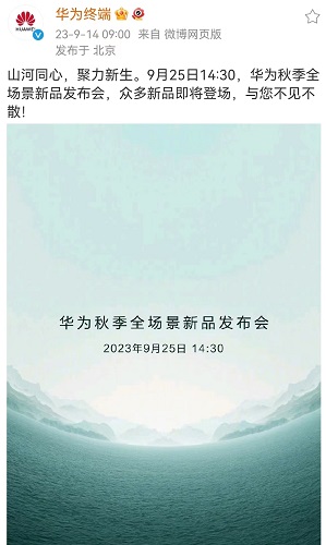 華為秋季全場景新品發布會將于9月25日舉辦