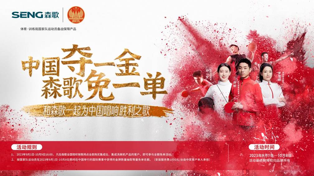 今年9月,森歌發(fā)起了“中國奪一金,森歌免一單丨和森歌一起為中國唱響勝利之歌”、“勝利之歌助威”助力等活動(dòng)。森歌向消費(fèi)者承諾,活動(dòng)期間將按國家隊(duì)運(yùn)動(dòng)員在中國舉行的國際賽事中獲得的金牌數(shù)量抽取等量免單名額,為購買集成灶、集成水槽、集成洗碗機(jī)產(chǎn)品的用戶,提供全額免單的機(jī)會(huì)。隨著各項(xiàng)國際賽事的圓滿落幕,中國隊(duì)共奪得210金,森歌也將送出共215個(gè)免單。(包含線上5名)