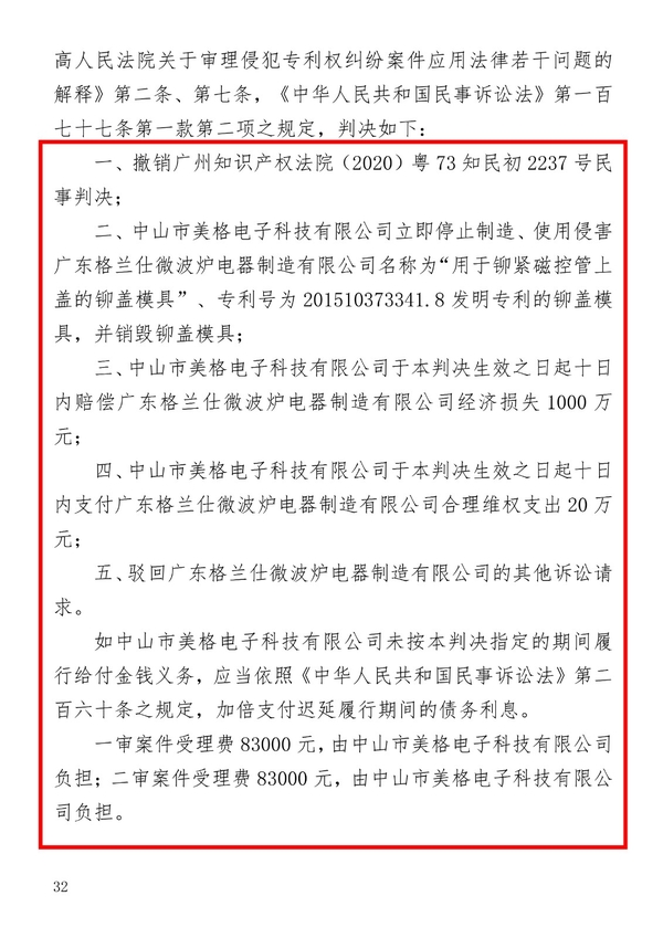 該判決書顯示, 中山市美格電子科技有限公司立即停止制造、使用侵害廣東格蘭仕微波爐電器制造有限公司名稱為“用于鉚緊磁控管上蓋的鉚蓋模具”、專利號為201510373341.8發明專利的鉚蓋模具,并銷毀鉚蓋模具。