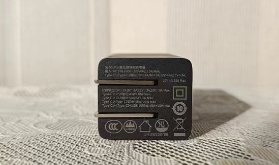 從輸出標注來看,兩個Type-C接口(C1+C2)單口使用都可以提供65W的最大輸出功率,USB口單獨使用是提供60W的最大輸出功率。雙口同充,C1+C2口可以提供45W+20W的最大輸出功率,C1+USB口同時輸出可以提供45W+18W的最大輸出功率,C2+USB口同時輸出能提供5V3A最大15W輸出功率,三個口同充,則能夠提供45W+15W的最大輸出功率。