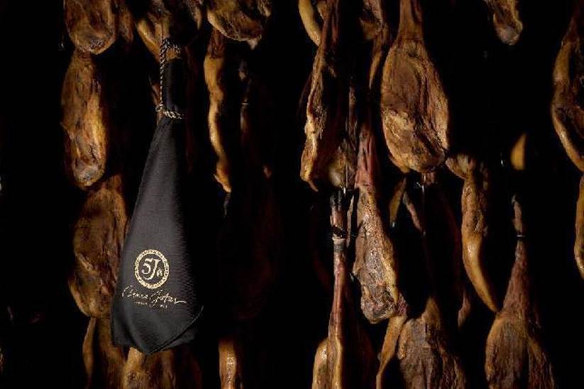 擁有143年悠久歷史、與魚子醬里雄魚子一樣珍貴、選用橡果喂養100%純種伊比利亞豬、超越了西班牙國家法定等級黑標的質量標準的5J (Cinco Jotas)西班牙黑標火腿 。