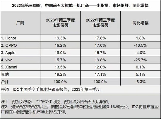 IDC:榮耀Q3摘得中國智能手機市場份額第一 vivo下滑25.7%