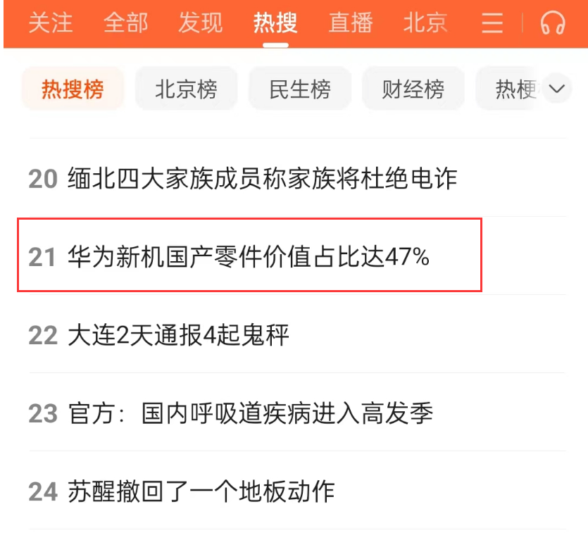 “華為新機國產零件價值占比達47%”沖上百度熱搜 網友:中國制造加油
