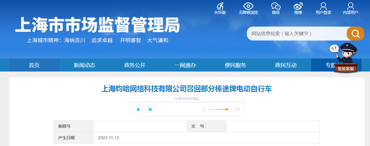 導讀:  家電消費網11月16日訊 昨天,天津市百大科技有限公司主動向天津市市場監督管理委員會報告了召回計劃,自即日起,召回2019年10月8日制造的TDT886Z型號賽鴿牌電動自行車,涉及數量為4輛;2023年2月12日制造的T
