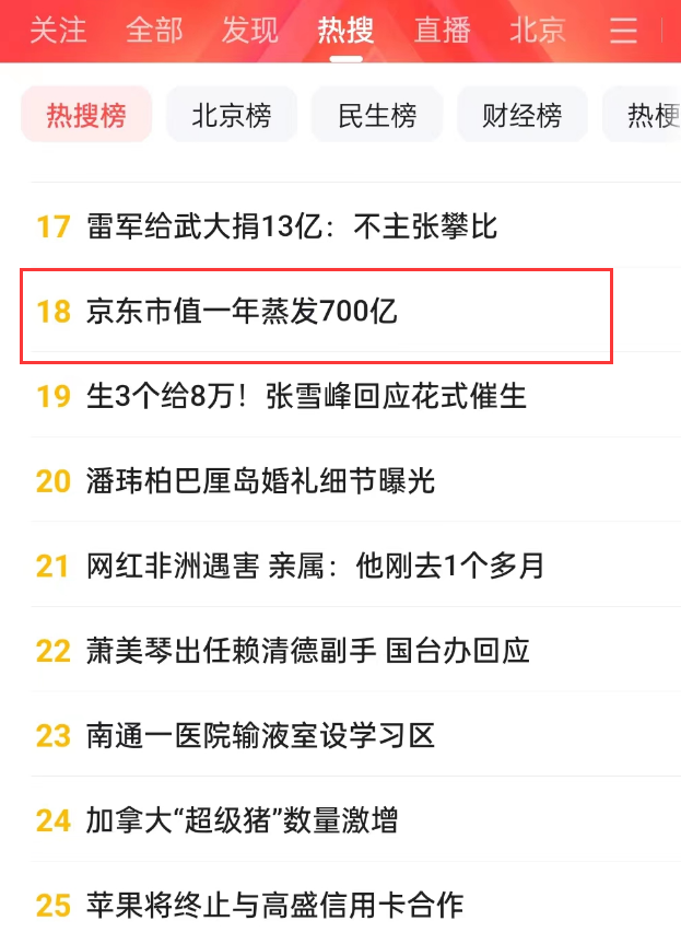 “京東市值一年蒸發(fā)700億”沖上百度熱搜