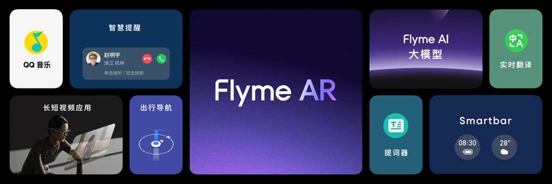 MYVU AR 智能眼鏡還搭載了最新發布的 Flyme AI 大模型,基于 AI 大模型和傳統語音能力深度融合,具備豐富且實用的語音應用,重新定義個人語音助理,全天候解決用戶的生活和工作難題;還能為用戶提供全能問答、旅游攻略、生活助手、健康生活等日常功能,甚至知識技能、職場發展、商業分析等專業服務也不在話下,是最好的個人助理載體。