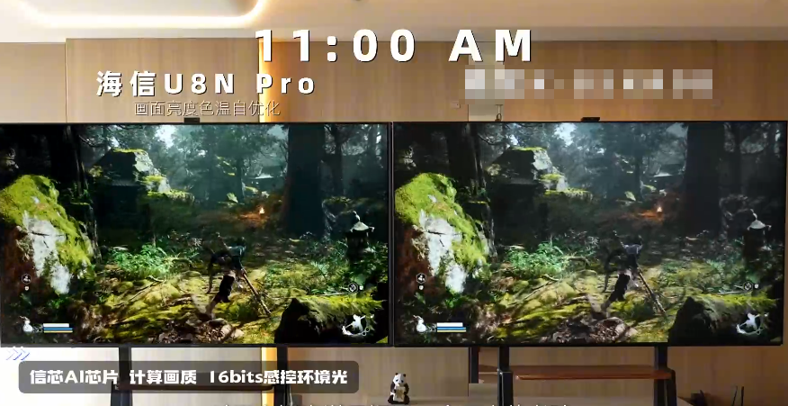 游戲場景中的AI畫質調校同樣出色。比如在中午強烈光線干擾下,用海信電視U8玩游戲,游戲畫面不僅色彩更飽滿、對比度更高,而且兼顧了畫面流暢度。這也解釋了為何《黑神話:悟空》選擇與海信電視合作,對游戲進行專項畫質調校,一方面游戲畫面的色彩與暗部細節都獲得了優化,林木蒼翠,洞府幽深,帶來十足的真實感與層次感,另一方面整體環境的光影呈現,更加貼近中式美學氛圍。