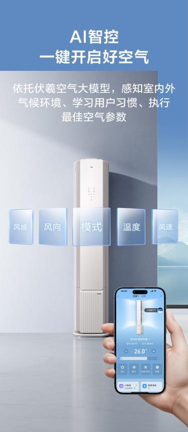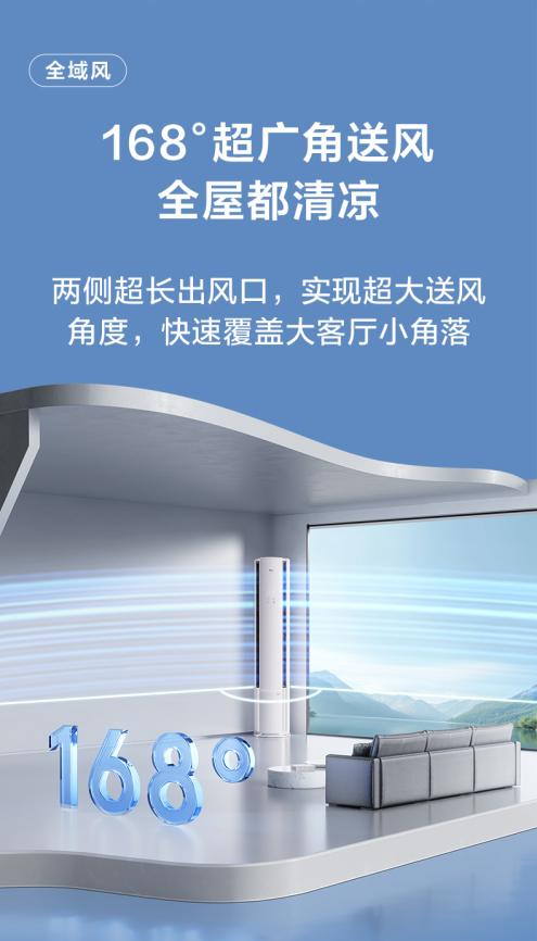 雙出風口獨立控制更是一大亮點,實現了分區送風。用戶可以根據家庭成員的不同需求,調節左右出風口的柔風模式。老人怕直吹,就可以將老人所在區域的出風口設置為柔和送風;寶寶需要避開冷風,也能輕松實現。環抱附壁流技術則讓氣流貼壁環繞,冷熱均勻送達每個角落,營造出涼而不冷、暖而不燥的舒適環境。通過「AI智控」一鍵開啟好空氣,立刻就像置身于大自然中,微風輕拂,愜意無比。