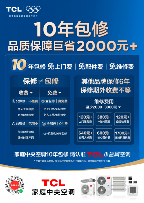 當前,TCL空調推出“十年包修”服務,凡是購買TCL家用空調小藍翼系列、家中空調小藍翼風管機、恒勁風二代風管機及小多聯、真省電pro風管機等產品的用戶,均可享受整機10年免費包修服務,全免費包括上門費、零件費、檢修費和人工費,且使用原廠配件和工藝,由廠家直接負責。這一服務周期幾乎覆蓋了產品的全生命周期,真正實現“一次購買,十年安心”。
