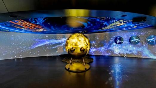 九天攬勝展項:投影機巧妙地隱藏安裝,以弧形背景墻投影為基礎,搭配全息投影交互裝置,構建出一個極具未來感與互動性的空間。觀眾可以通過交互系統寫下對航天事業的美好寄語,讓寄語隨著火箭“升空”,化作漫天的璀璨星光。