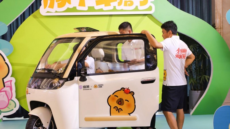 產品陳列區以“解剖式展示”讓米粒E01的細節設計無所遁形。馬卡龍治愈色車型一字排開,從溫暖的巧克棕、栗子棕到夢幻浪漫的霞光紫、海霧藍,成為現場最出片的“拍照打卡墻”。在零部件展區,輪胎的紋路觸感、高回彈的舒適座椅樣本均可親手觸摸,1500W的電機直觀呈現強大動力,讓“快”有了可感知的重量。IP聯名場景區中,盛昊篷車×卡皮巴拉小黃豚聯名款篷車被打造成“移動的治愈小窩”,而日常生活主題展示中,則通過氛圍感場景讓“小快靈穩”的優勢融入到生活中。