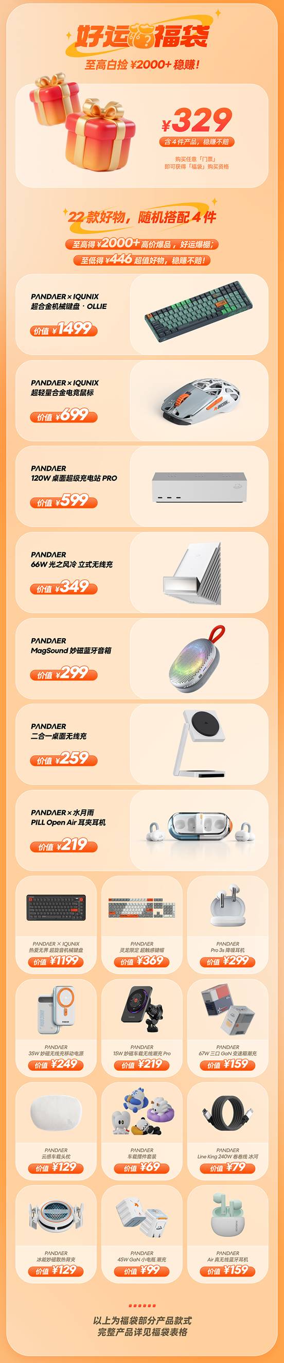 此次活動,就一個字:值!「福袋」相當于數碼產品界的盲盒,¥329 的「好運福袋」買一得四,至高開 ¥2000+。以超值的價格,就可以有機會擁有眾多用戶都追捧的科技潮流產品。根據官方公布的產品明細和中獎率來看。一個福袋放 4 款產品,最高價值的產品組合高 2076 元,最低也有 446元,也就是一定是穩賺不賠的, 相當于福袋是 1-7 折薅羊毛,福袋里不乏高價值的人氣爆款產品。22 款好物隨機組合,福袋里的產品不會重復!