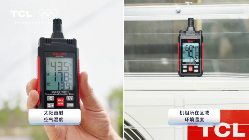 在極端高溫環(huán)境中,空調(diào)外機常面臨啟動困難、制冷效率下降等挑戰(zhàn)。而TCL小藍翼C7新風(fēng)空調(diào)的一大核心亮點,便是其出色的高溫適應(yīng)性與穩(wěn)定運行能力。據(jù)悉,該機型可在高達66℃的極端環(huán)境中保持正常運行,即便在55℃高溫下制冷效果依然不衰減。為驗證這一性能,測試團隊首先對多個關(guān)鍵溫度點進行了全面監(jiān)測,包括太陽直射地表溫度、太陽直射空氣溫度以及空調(diào)機組周邊環(huán)境溫度。