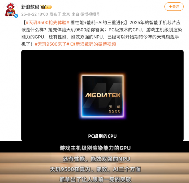 媒體新浪數碼直言:“PC級技術的CPU,游戲主機級別渲染能力的GPU,還有性能、能效雙強的NPU,天璣9500在算力、能效、AI這三個方面都拿出了讓人眼前一亮的突破。”