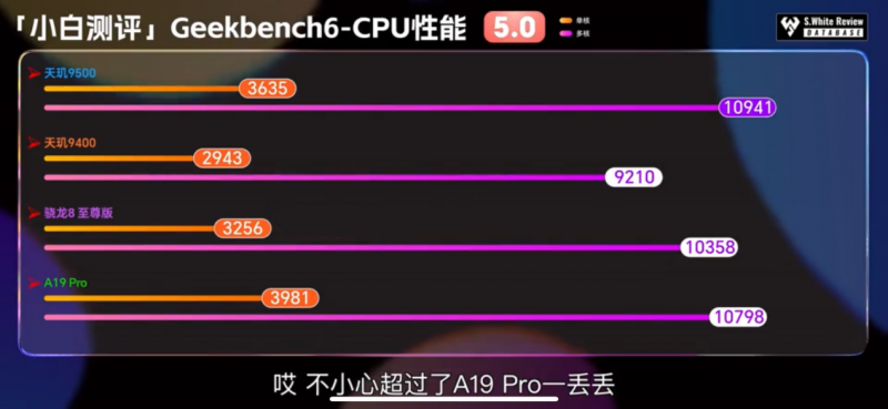 據媒體小白測評的實測數據顯示,天璣9500的Geekbench6跑分上,4.21G的C1-Ultra 常溫環境下單核跑到了3635分,比上代提升了23.5%,其單核接近蘋果最新的A19 Pro;天璣9500的多核的CPU峰值跑到了10941分,對比上一代提升比較明顯,也比驍龍8至尊版要強一些,更是直接超過了 A19 Pro。