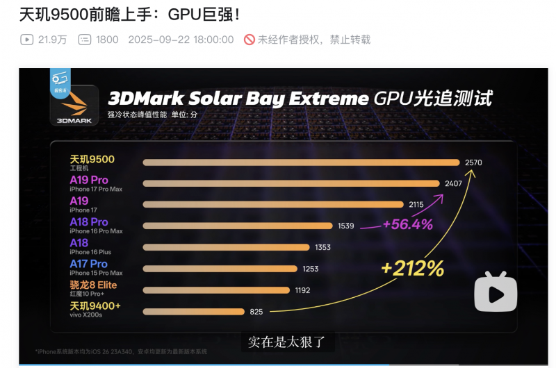 極客灣Geekerwan 稱贊天璣9500的GPU時稱:“實際上這顆GPU的光追性能確實提升巨大,Solar Bay Extreme甚至超過了2570分,蘋果今年提升超過50%我們都覺得很離譜了,發哥這是翻了3倍,甚至比蘋果還強,這實在是太狠了。”