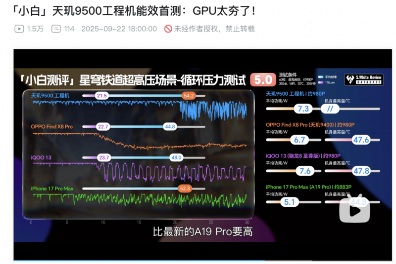 “在超高壓場景,數據5.0星鐵黃金的時刻,上代旗艦處理器基本都在10分鐘就出現了降幀,9500工程機是在20分鐘之后,抗壓能力提升明顯。當然工程機在幀率上的策略,并非一上來就穩得很高。平均幀率54.2FPS,比最新的A19 Pro高,而且9500工程機的畫質是高于iPhone的。功耗7.3W,結合幀率表現來看,這功耗確實很亮眼。