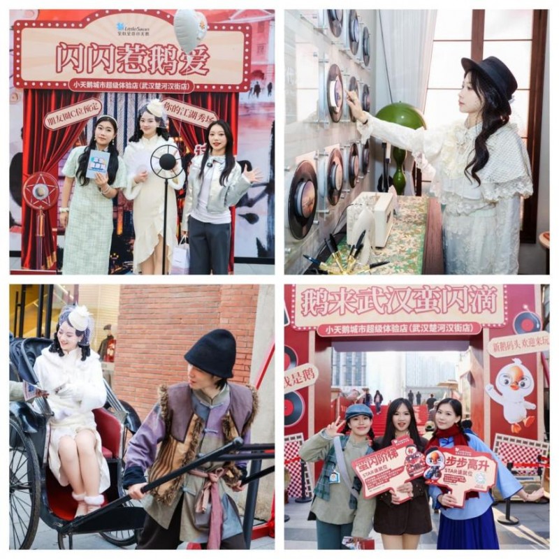武漢,一座充滿活力與煙火氣的城市,這里的市民熱情豪爽,注重生活品質,對新鮮事物充滿好奇。小天鵝在策劃營銷活動時,就精準把握城市脈搏,將開業活動與武漢的地域特色、文化氛圍緊密相連,開啟了地域共振式營銷新征程。從身著民國郵差服穿梭于太極廣場、蠻閃階梯、閃耀之城的報童,到民國歌星、車夫、大學生等劇場NPC,從沿漢街核心路線巡游的民國風花車,到充滿地域風情的搖擺舞,從身穿民國服飾的“一日店長”,到華麗而典雅的民國換裝區,每一處場景都精準呼應武漢人的歷史記憶,讓品牌訴求在文化體驗中自然滲透。