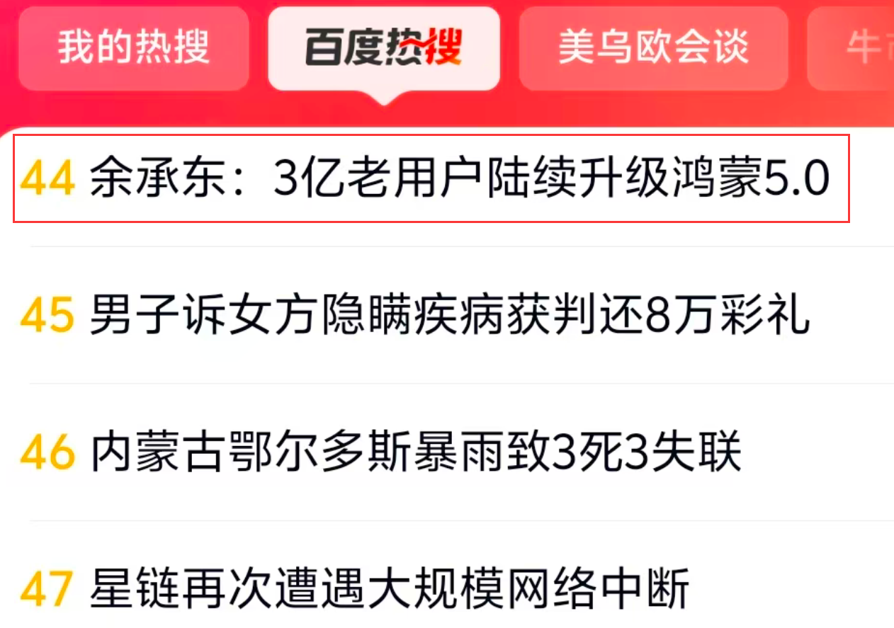 “余承東:3億老用戶陸續(xù)升級(jí)鴻蒙5.0”沖上百度熱搜