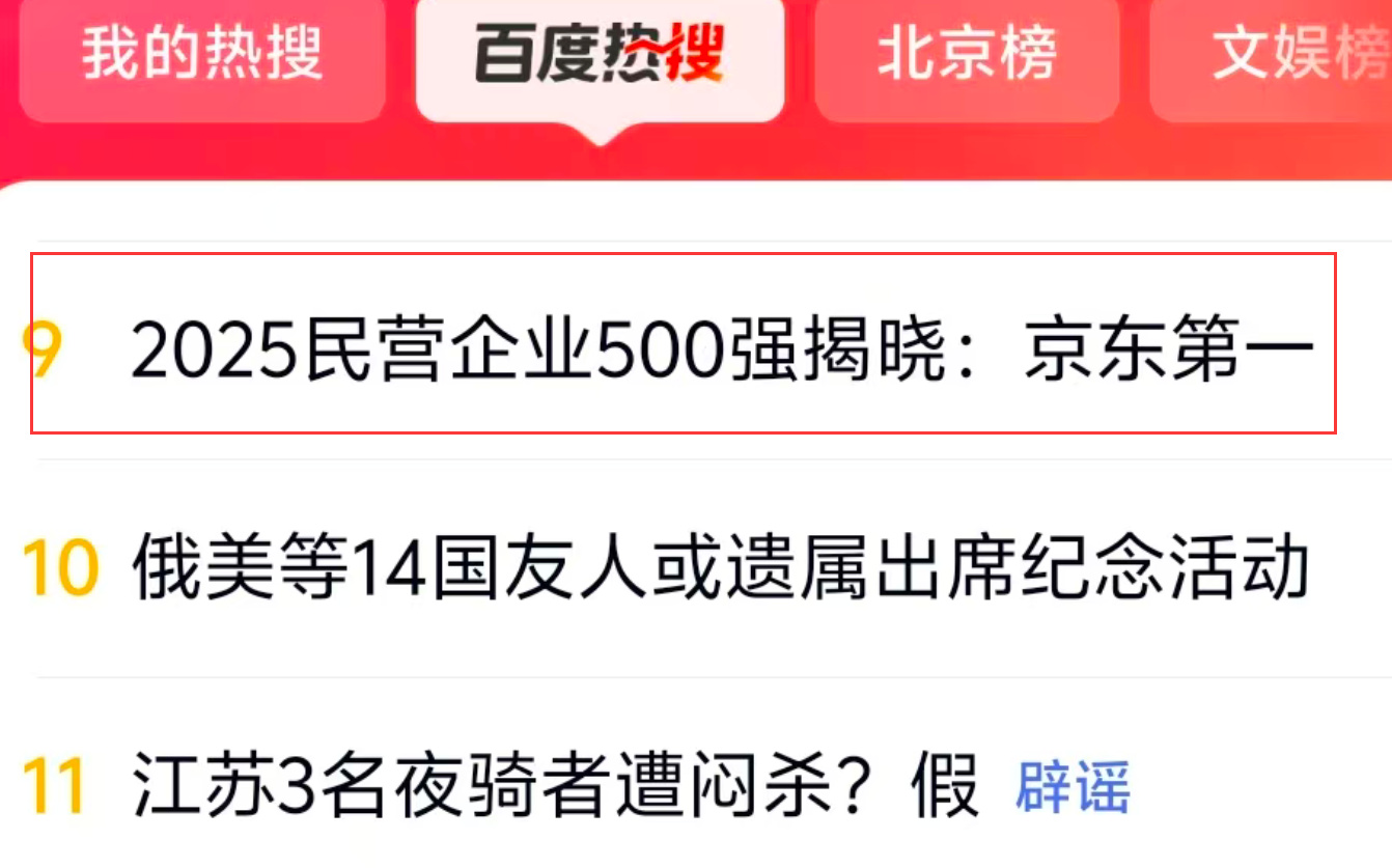 “2025民營企業500強揭曉:京東第一”沖上百度熱搜
