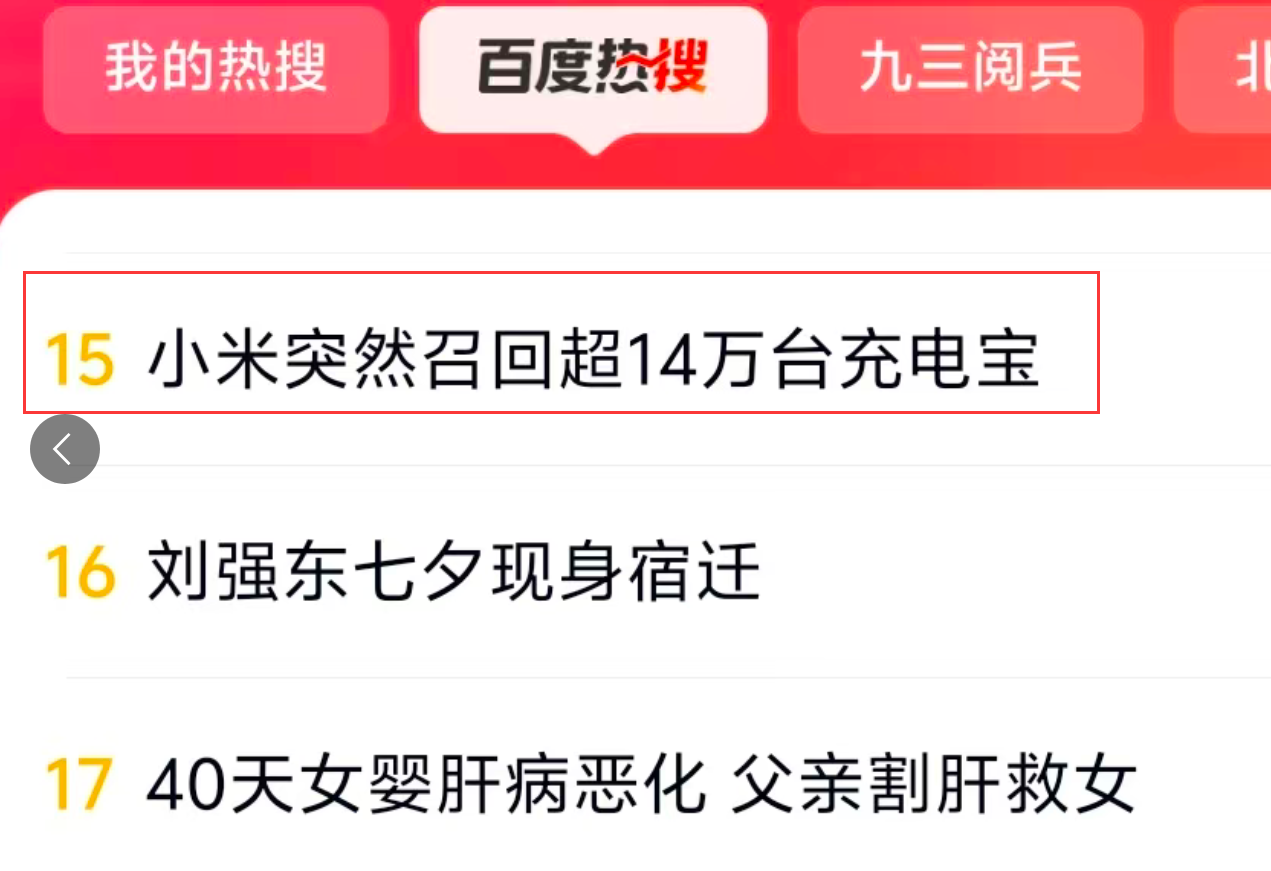 “小米突然召回超14萬臺充電寶”沖上百度熱搜