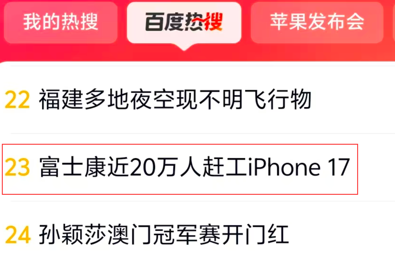 “富士康近20萬人趕工iPhone 17”沖上百度熱搜