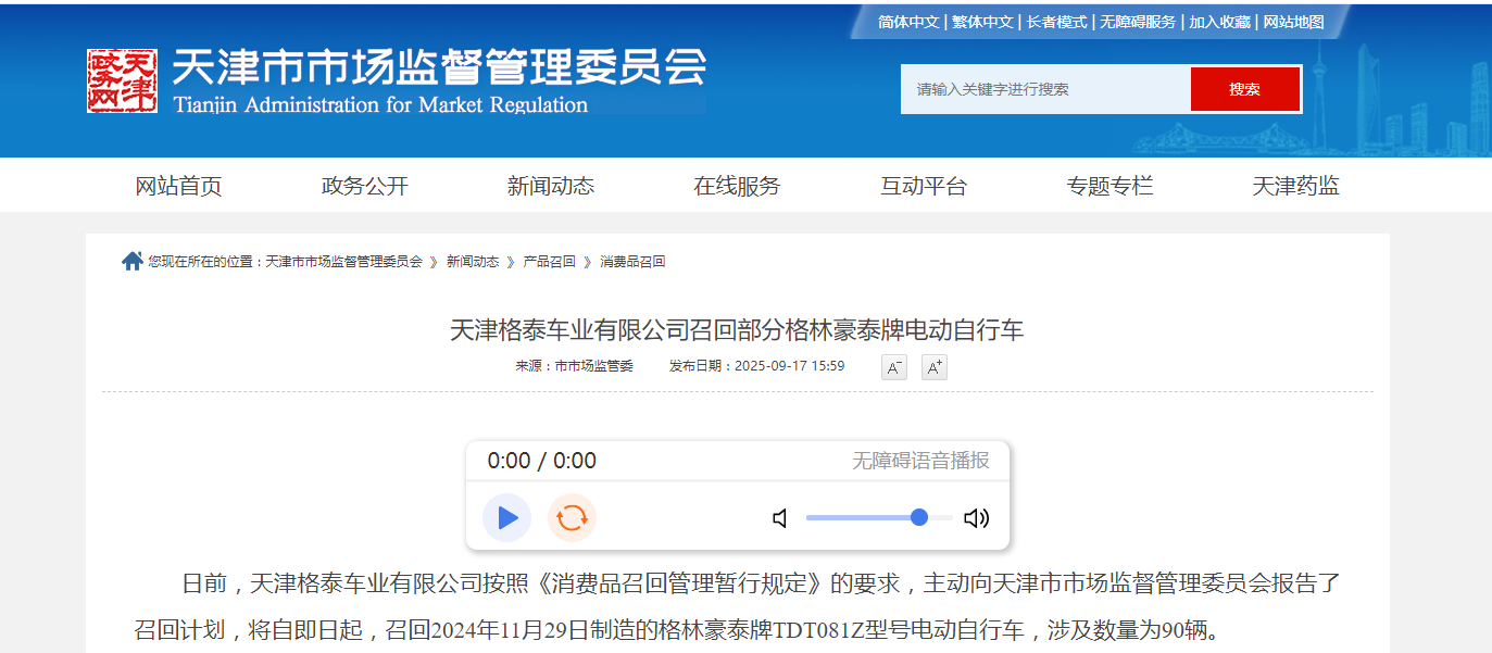 家電消費網9月18日訊 昨天,天津格泰車業有限公司按照《消費品召回管理暫行規定》的要求,主動向天津市市場監督管理委員會報告了召回計劃,將自即日起,召回2024年11月29日制造的格林豪泰牌TDT081Z型號電動自行車,涉及數量為90輛。