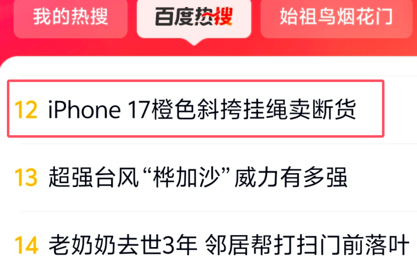 家電消費網9月22日訊 今天,“iPhone 17橙色斜跨掛繩賣斷貨”沖上百度熱搜。