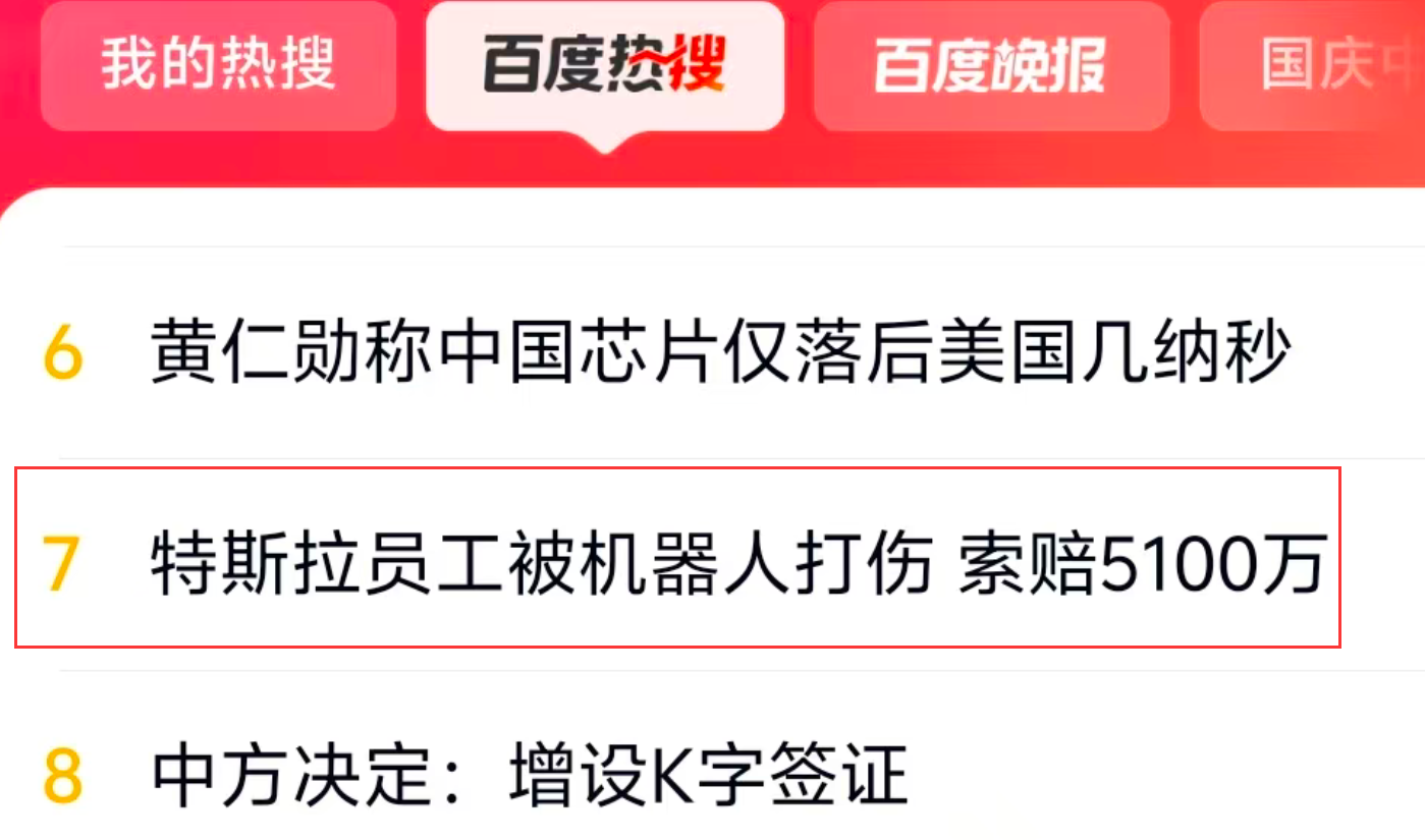 “特斯拉員工被機器人打傷 索賠5100萬”沖上百度熱搜