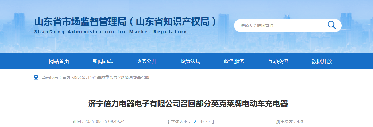 家電消費網10月6日訊 昨天,山東倍力電器電子有限公司受缺陷調查影響按照《消費品召回管理暫行規定》的要求,主動向山東省市場監督管理局報告了召回計劃,將自即日起,召回2023年6月5日制造的部分英克萊牌型號DZQS602001-C 電動車充電器,涉及數量為20個。