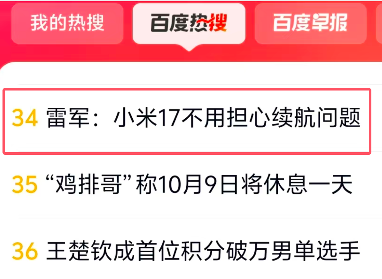 - “雷軍:小米17電量幾乎是iPhone17兩倍”沖上百度熱搜