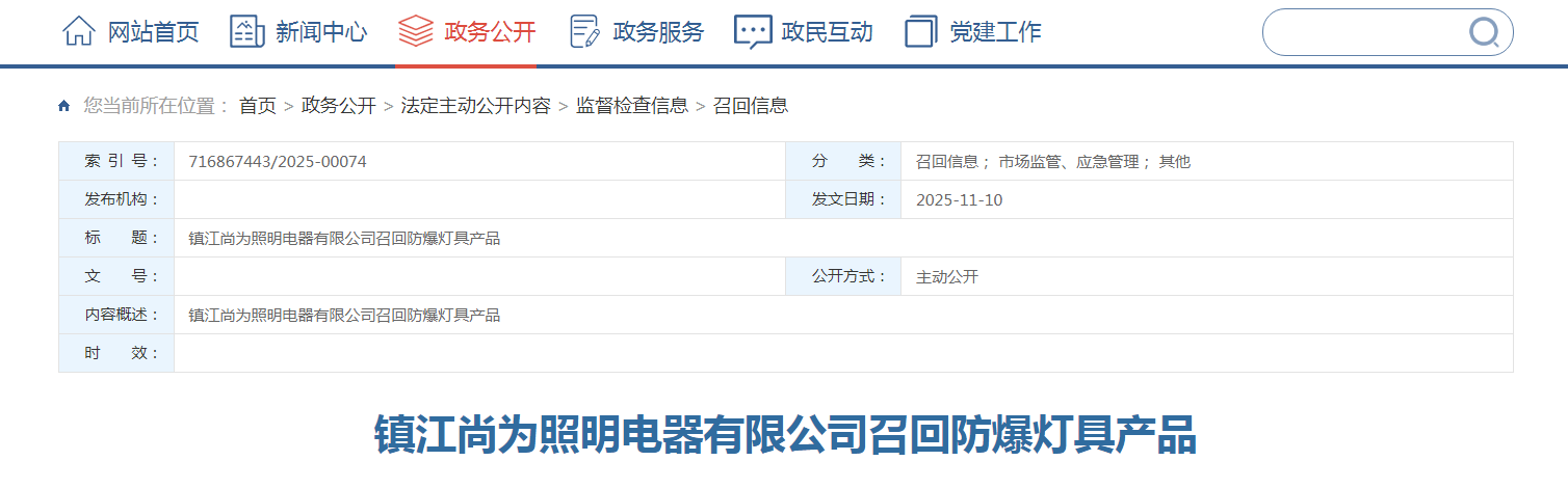 家電消費網11月13日訊 昨天,江蘇省鎮江尚為照明電器有限公司按照《消費品召回管理暫行規定》《江蘇省缺陷消費品召回管理辦法》的要求,主動向鎮江市市場監督管理局報告了召回計劃,將自即日起,召回2025年1月至2025年10月期間制造的CH-SNWEL牌防爆燈具產品,涉及數量為500臺。