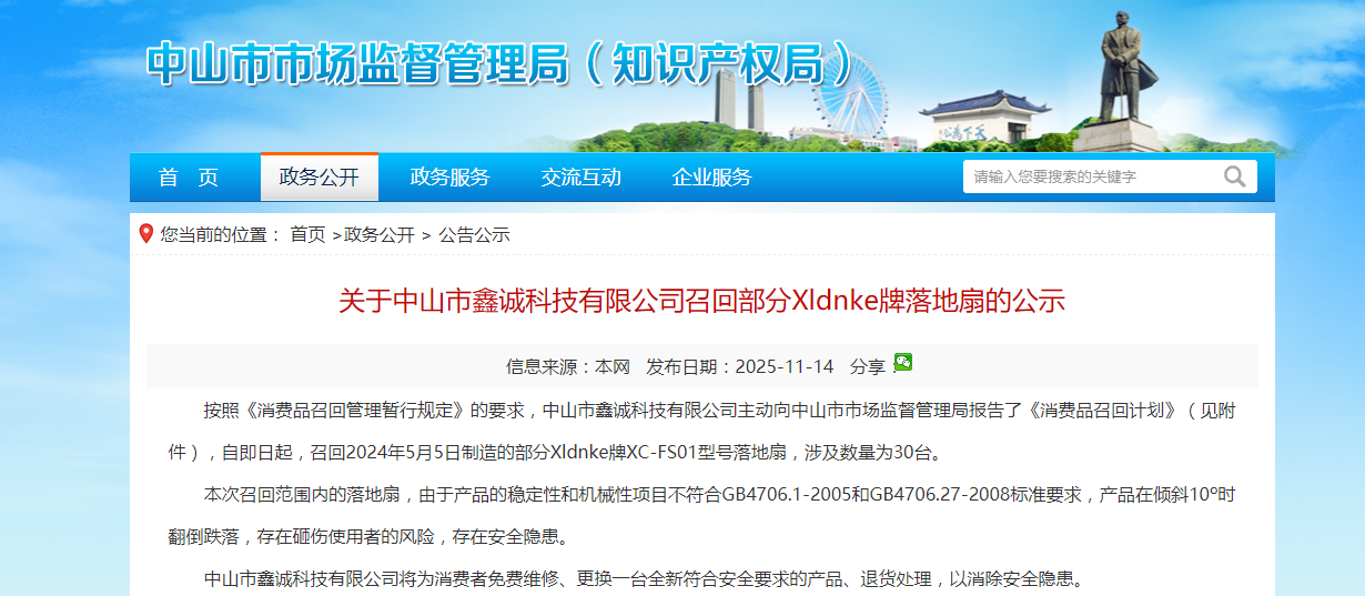 - 鑫誠(chéng)科技召回部分Xldnke牌落地扇 易翻倒跌落存砸