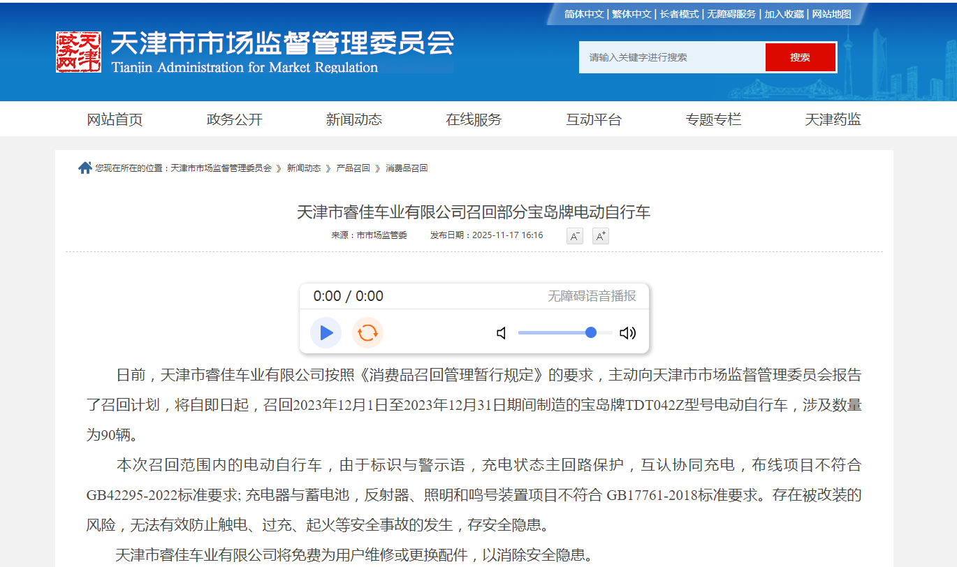 導讀: 家電消費網11月18日訊 昨天,天津市睿佳車業有限公司按照《消費品召回管理暫行規定》的要求,主動向天津市市場監督管理委員會報告了召回計劃,將自即日起,召回2023年12月1日至2023年12月31日期間制造的寶島...