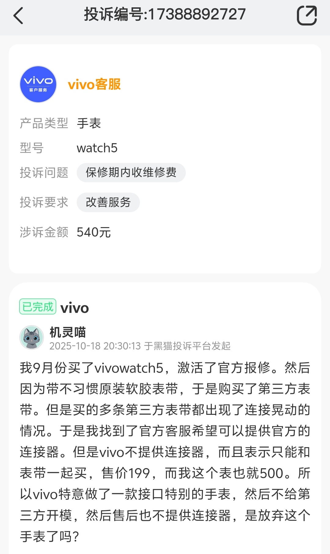 該消費者找到vivo官方客服,希望可以提供官方的連接器。但是vivo不提供連接器,而且表示只能和表帶一起買,售價199元。該消費者表示不滿,這個表也就540元。