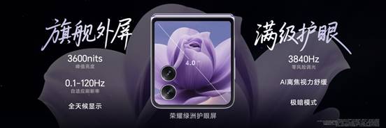 榮耀Magic V Flip2的內外屏素質延續旗艦級表現。6.82英寸榮耀綠洲護眼內屏,峰值亮度5000nits,支持4320Hz零風險調光;4.0英寸榮耀綠洲護眼外屏,峰值亮度3600nits,支持3840Hz零風險調光。內外屏均支持LTPO 2.0自適應刷新,同時搭載AI離焦視力舒緩、AI干眼友好、極暗模式等護眼功能,為用戶不同場景的用眼提供全面守護。