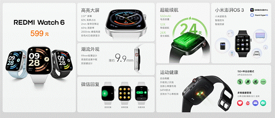續航方面,550mAh大電池帶來至長24天超長續航,常規使用可達12天。全新小米澎湃OS 3實現表端控車、米家互聯、小米超級島,支持SU7/YU7等多款NFC車鑰匙,以及表端微信消息收發與回復。支持心率、血氧、睡眠、壓力、女性健康管理,內置呼吸訓練功能,結合專業指導與細膩振感,助力身心放松。支持150+運動模式,5ATM防水,GNSS獨立定位,雙L1天線精準導航,全面滿足運動與日常使用需求。REDMI Watch 6,以旗艦配置與智能交互,開啟健康時尚新生活,售價 599 元,發布會后正式開售。