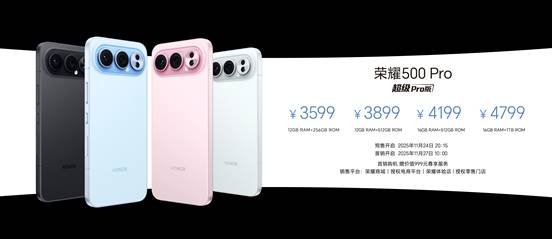 榮耀500系列共帶來“海藍寶”、“星光粉”、“月光銀”、“曜石黑”4款水晶配色,售價方面,榮耀500標準版12GB+256GB、12GB+512GB和16GB+512GB版本售價分別為2699元、2999元和3299元;榮耀500 Pro版12GB+256GB、12GB+512GB、16GB+512GB和16GB+1TB版本售價分別為3599元、3899元、4199元和4799元。現(xiàn)已在榮耀商城、授權電商平臺、榮耀體驗店、授權零售門店開啟預售,并于11月27日10:00正式開售,首銷購機贈價值999元尊享服務。