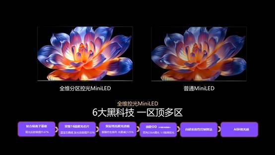 D7H Ultra搭載6大控光黑科技,包括復合銀離子基座、雙驅16晶聚光芯片、藍寶石晶底等,D7H Ultra實現背光反射率提升47%、發光效率提升33%、光暈減少25%。配合微距OD技術和AI環境光感,控光更精準,電視厚度降低50%,畫面層次更豐富,色彩更生動。