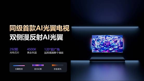 作為同層級首款AI光翼電視,D7H Ultra兩側配備292顆光電芯片氛圍燈,采用漫反射設計,4500K黃金色溫、120°超廣角,讓光線均勻鋪滿墻面,瞬間提升客廳氛圍感,為用戶帶來沉浸式情緒體驗。
