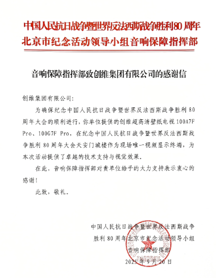 此次閱兵活動,創維再次被選用,并收到了由中國人民抗日戰爭暨世界反法西斯戰爭勝利80 周年北京市紀念活動領導小組音響保障指揮部舉辦方頒發的感謝信。這既是對創維電視品質的高度肯定,也確立了創維“閱兵電視”的地位,更是成為中國電視產業一項具有歷史意義的成就。