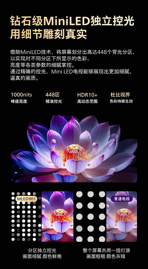 飛利浦100MLED901借助MiniLED技術,能夠實現暗場深邃純粹、亮場通透不刺眼的極致效果,其將屏幕劃分出高達448個背光分區,以實現對不同分區下所顯示的色彩、亮度等各類參數的細膩掌控。搭配1000尼特高峰值亮度、杜比視界,呈現更細膩、逼真的畫面效果。