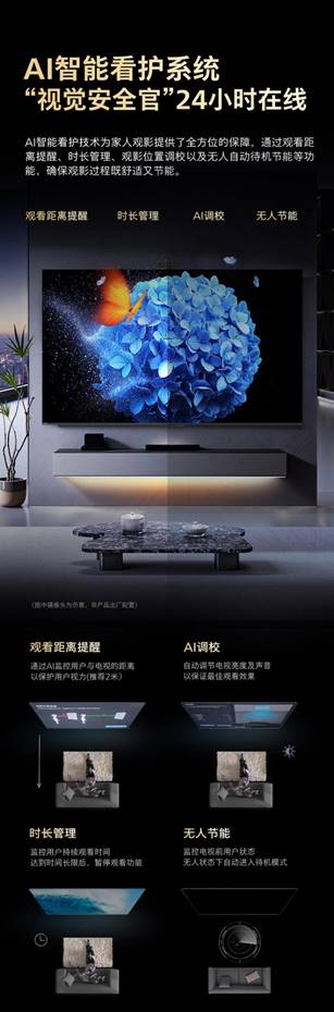 AI智能看護技術為家人觀影提供了全方位的保障,通過觀看距離提醒,監控用戶與電視的距離以保護用戶視力(推薦2米);時長管理,監控用戶持續觀看時間,達到時間長限后,暫停觀看功能;觀影位置調校,自動調節電視亮度及聲音,以保證最佳觀看效果;無人自動待機節能,無人狀態下自動進入待機模式等功能,確保觀影過程既舒適又節能。