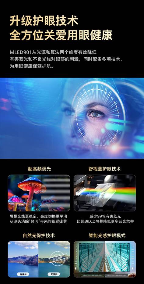 飛利浦100MLED901從光源和算法兩個維度,有效降低有害藍光和不良光線對眼部的刺激,同時配備超高頻調光、舒視藍護眼技術、自然光保護技術、智能光感護眼模式等,為用眼健康保駕護航。