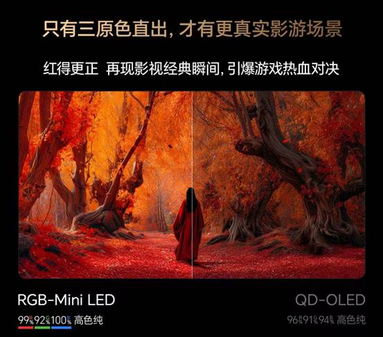 如果說芯片解決的是“看的準”、屏幕解決“看的清”,那么控光則決定了100寸電視是否“看的真”。不同于過去單純追求背光數量,如今行業已經邁入了追求控光“精度”的全新維度。在這點上,作為RGB-Mini LED電視的開創者和引領者,海信100寸電視帶來的是從“單一控光”到“光色同控”的全面提升,RGB-Mini LED電視的每個微小背光單元,都集成了獨立高效的紅、綠、藍三原色燈珠,能對每個區域亮度和色彩精準調控。比如用海信E8S Pro看《星際穿越》卡岡圖雅黑洞場景時,引力透鏡效應產生的奇異光束高亮且色彩絢爛,黑洞本身及周圍的宇宙空間保持深邃的黑度,毫無傳統大屏的大塊色暈和層次模糊。