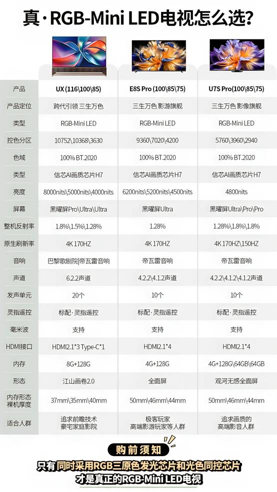 結語:海信憑借領先行業的RGB-Mini LED技術開啟了高端電視的新藍海市場。同時需要警惕的是,市面上有一款假RGB-Mini LED電視Q9M,利用萬元以內低價的噱頭誤導消費者,實際上采用“BG-Mini LED+紅色熒光粉”的顯示方案。想要體驗高端影音氛圍的消費者切記,真正的RGB-Mini LED是高端技術,目前價格都在萬元以上,萬元以下假貨多。只有同時采用RGB三原色發光芯片和光色同控芯片,才是真正的RGB-Mini LED。買RGB-Mini LED電視首選海信。