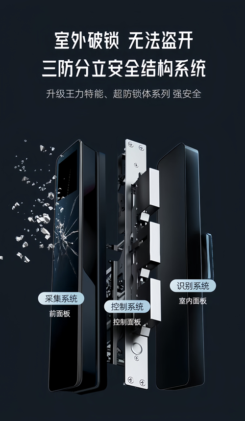 此外,王力獨創的三防分立技術通過將識別、采集和控制三大核心模塊物理隔離,即使前面板遭受暴力破壞仍能有效阻斷非法開啟路徑,實現“破拆不破防”的極致安全防護。此外,再結合智能貓眼實時監控系統打造的可視化智能防線,為家庭安全樹立堅不可摧的科技屏障。