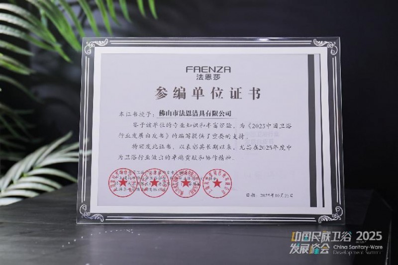 峰會現場,《2025中國衛浴行業發展白皮書》重磅首發,依托海量權威數據,從行業生態、全球格局、產業鏈、市場、用戶、電商、品牌、供應鏈等多維視角,深度解析核心脈絡與未來趨勢,為企業破局指路。法恩莎受邀以參編單位身份助力白皮書編撰,以行業內領先的藝術造詣、專業技術和豐富行業經驗,為白皮書的編寫獻智獻策。